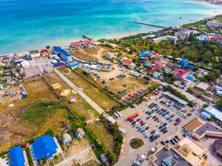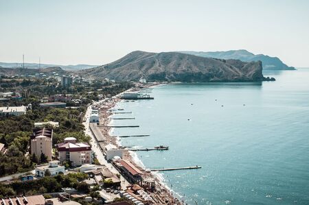 View of the Black Sea, beach and mountains. The resort town of Anapa. Russia. Photo taken in spring.