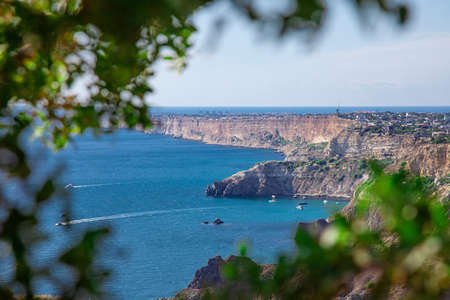 Beautiful view from the cliff on the blue sea. Incredible coast with freestanding cliffs in the sea. Cape Fiolent, Crimea.