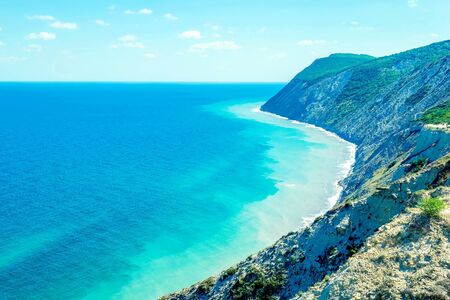 Bright blue color Black sea shore of Crimea peninsula with high cliff on the cost. Paradise stone beach.