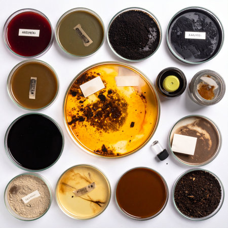 A top-down view captures a diverse collection of petri dishes, each a self-contained world of scientific inquiry. From dark soil samples to vibrant bacterial blooms, this array represents a complex experiment in progress, showcasing the meticulous process of research, analysis, and the quest for discovery in a laboratory environment.