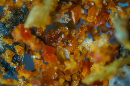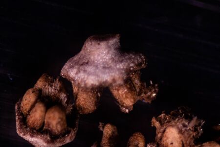 green yellow round fungal mold on a heterogeneous black surface, macro science abstract background