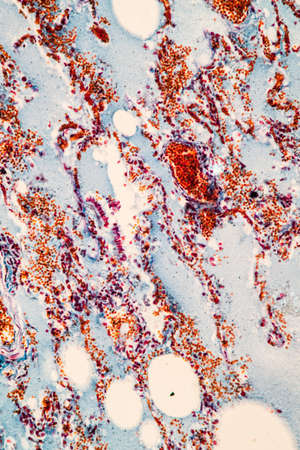Ovarian cancer, light micrograph, photo under microscope. Photograph shows a fragment of a cancerous tumor in the female ovary. Selective focus