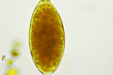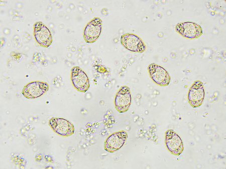 Egg of intestinal fluke in human stool, analyze by microscope, original magnification 400x