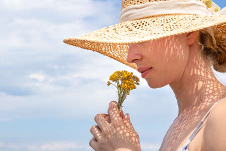 Portrait of young beautiful cheerful woman wearing straw sun hat, smelling small bouquet of yellow wild florets, against blue summer sky.