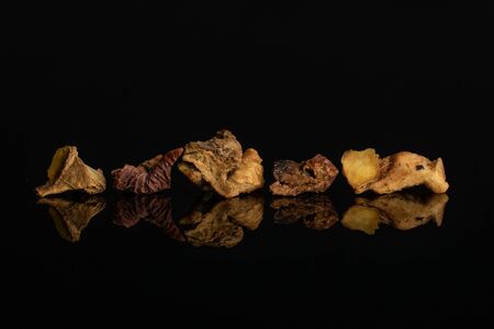 Group of five pieces of roseship with orange rind of lingonberry strawberry fruit tea macro isolated on black glass