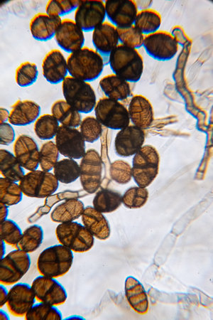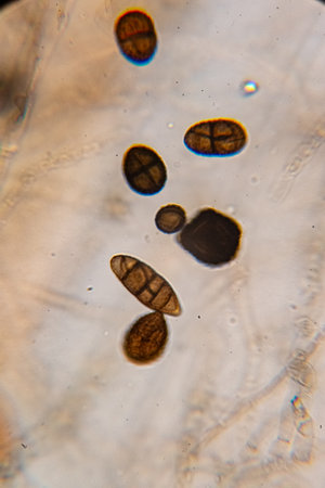 Dematiaceous Fungal Spores Exhibiting Transverse and Longitudinal Septation, Likely of the Genus Alternaria.