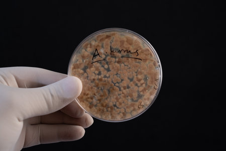 Macro View of Aspergillus terreus Colony Growth in a Petri Dish, Highlighting Fungal Morphology for Mycology Studies.