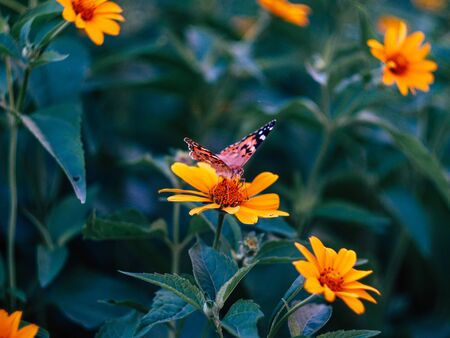beautyfull butterfly sitting on a flower near green leaves on a summer evening