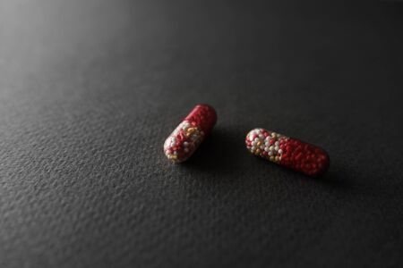 Medicine pills on black background. Medical, healthcare or pharmacy concept. Free copy space