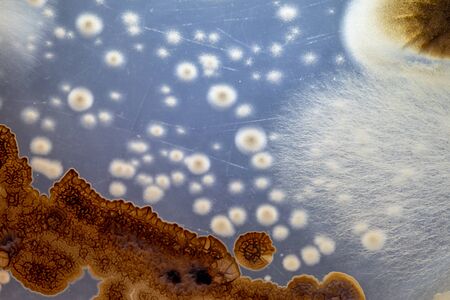 Backgrounds of Characteristics and Different shaped Colony of Bacteria and Mold growing on agar plates from Soil samples for education in Microbiology laboratory.