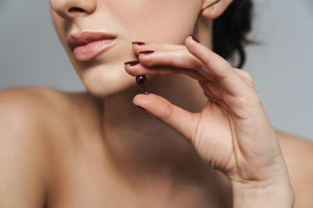 Image of beautiful half-naked woman posing with cosmetic vitamin capsule isolated over gray wall