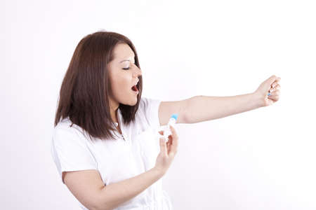 Asian lady girl spraying medicine in mouth,disinfecting in her oral,prevention of respiratory infection ,protect against the bacteria in throat before the germ enters the lungs