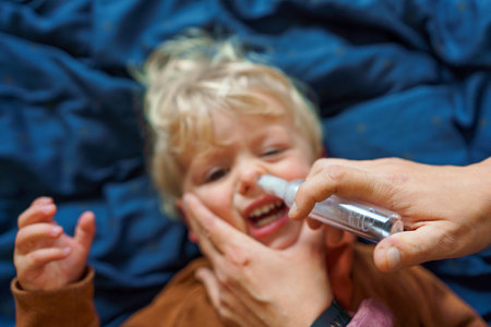 Man bundled in soft blanket spraying throat medication, managing flu symptoms while resting comfortably at home, seeking recovery from illness