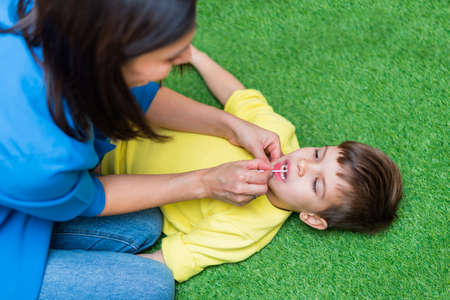 Helping a child perform first aid knee injury after she had an accident. Using antiseptic chlorhexidine, no pain