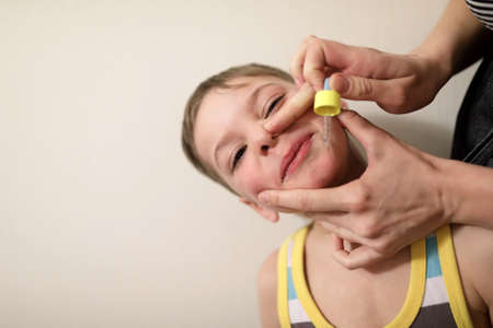 Nasal drop medicine use by man dripping into nose for clearing air path.On white background , selective focus.