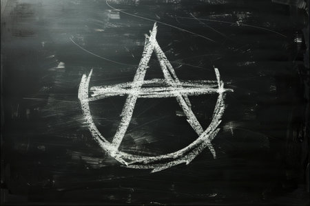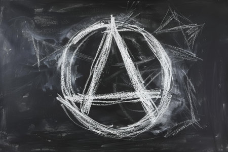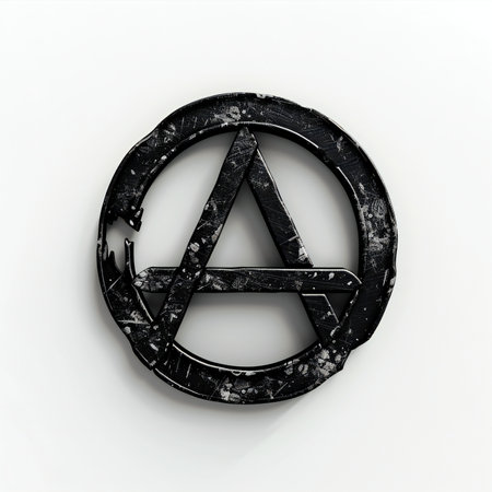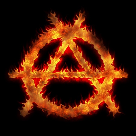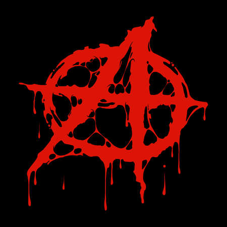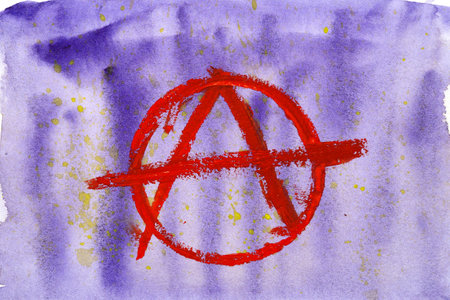 Striking red anarchist emblem painted over a starlike watercolor backdrop