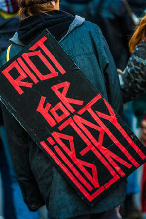 MONTREAL, CANADA, APRIL 02 2015. Riot in the Montreal Streets to counter the Economic Austerity Measures. Closeup of the Back of a protester Wearing a Sign Saying Riot For Liberty.
