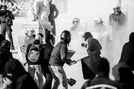 ATHENS, GREECE - APRIL 15, 2015: Riot police and protesters during a protest in front of Athens University, which is under occupation by protesters leftist and anarchist groups. Black-and-white reportage shooting.