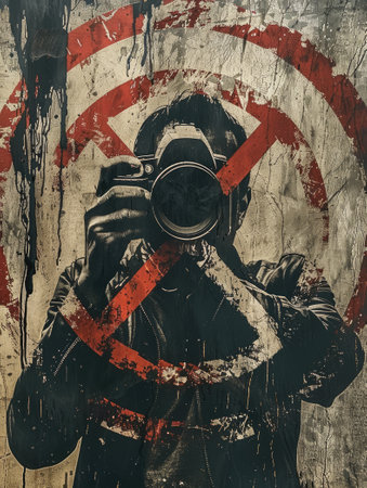 A lone figure in a red coat raises a fist in defiance against a row of riot police under a dramatic stormy sky, symbolizing resistance and courage.