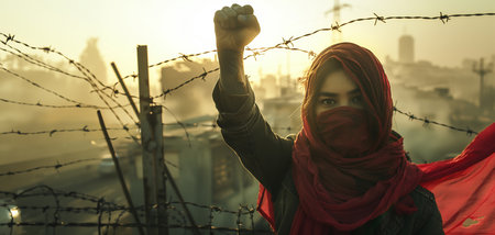 A woman with a red scarf and mask protests with raised fist behind barbed wire.