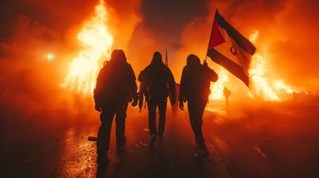 A group of individuals stands firmly in front of a massive, fiery barricade. Thick, black smoke billows into the sky, creating an ominous atmosphere. The flames are intense and engulf various debris on the ground. Each of the individuals is dressed in black and wears helmets, possibly for protection. The scene suggests a protest or riot situation, with the individuals possibly being a part of law enforcement or demonstrators. Despite the chaos, they stand resolute, facing the fire with determination and focus.