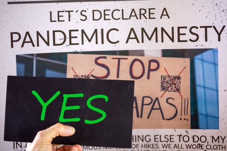 Symbolic image Pandemic Amnesty: Cut-out of a symbolic newspaper, a sign with the inscription YES is held in front of it. In the USA and many other countries, a debate has begun to come to terms with the Corona measures. The photo in the background of the image is by the compositor himself and was taken in Brussels in February 2022