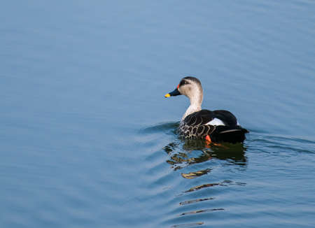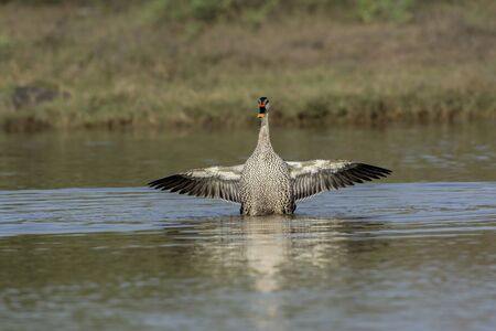 Indian Spot-Billed Duck (Anas poecilorhyncha) Flapping Wings.These are mainly grey ducks with a paler head and neck and a black bill tipped bright yellow.Juveniles are browner and duller than adults.