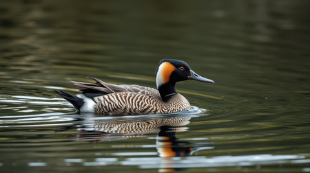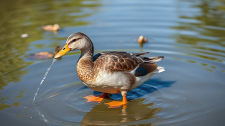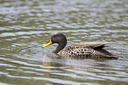 a lonely beautiful migratory wild duck floating on a pond, a brown plumage and a yellow beak, traces on the water behind a duck, a duck in a natural environment, daylight