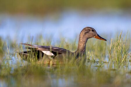Male Gadwall (Anas strepera) swimming in river. The gadwall is a bird of open wetlands, such as prairie or steppe lakes, wet grassland or marshes with dense fringing vegetation