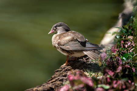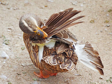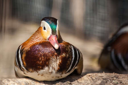 Close up shot of wild brown duck sitting on rock. Pond bird in resting pose, waterfowl in safari park
