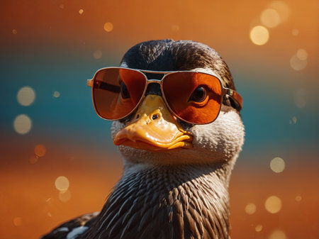Birds and animals in the wild. An amazing grunt duck swims in a lake or river with blue water under the sunlight landscape. Close up perspective of a funny duck