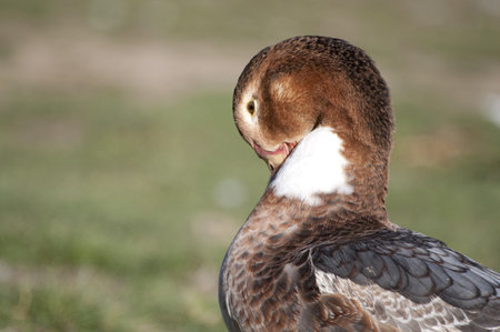 A bird is cleaning feathers in the green grass on the river bank. High quality photo