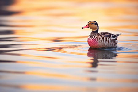 A duck floats on calm golden water at sunset. The sun is setting behind it creating a beautiful reflection