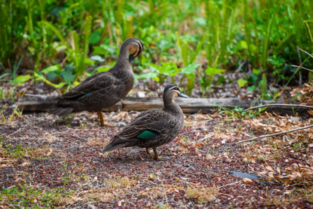 Couple of Australian Black Ducks standing on gravel with green leafy bushes in background