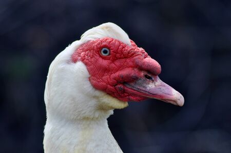 A muscovy duck Cairina moschata male outside on the grass. Close up portrait.