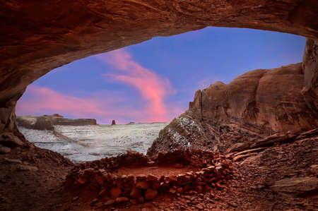 Indian spiritual place False Kiva in sandstone alcove with canyon view in winter. Sunset at Canyonlands National Park. Moab. Utah. United States.
