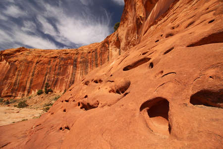 Unusual holes carved into the desert sandstone by erosion.