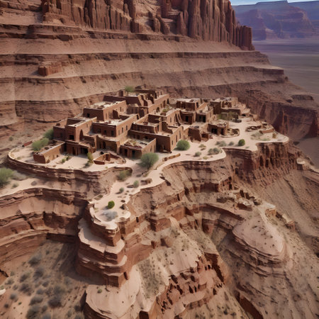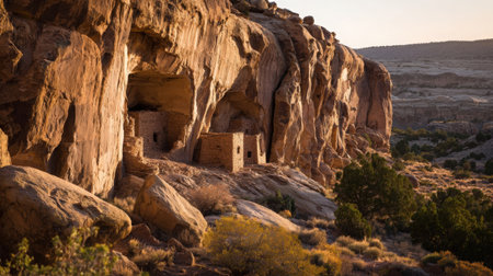 Discover ancient Native American cliff dwellings nestled within massive rock formations. The golden hour sun illuminates the weathered stone structures, highlighting their historical significance and remote desert landscape.