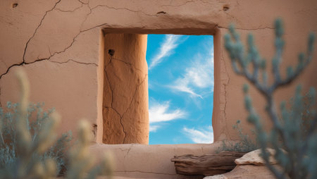 AI Generated. Desert Outpost Frame With Blue Sky View Through Rustic Adobe Wall Offering Peaceful Escape And Organic Design Inspiration