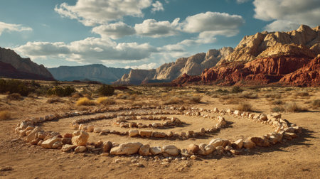 This captivating desert landscape features a mesmerizing stone spiral structure set against majestic mountains and a stunning cloudy sky.