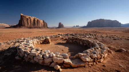 Stunning desert landscape featuring an ancient stone structure surrounded by dramatic rocky cliffs under a clear blue sky. Perfect for nature lovers.