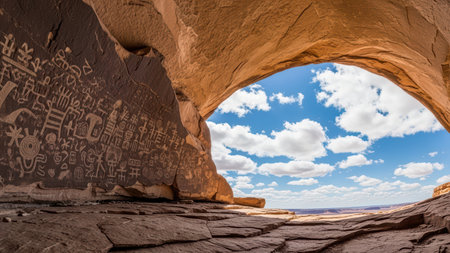 Ancient petroglyphs in natural cave with blue sky and clouds in desert landscape.