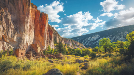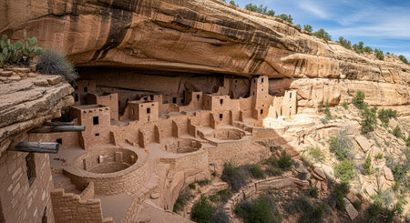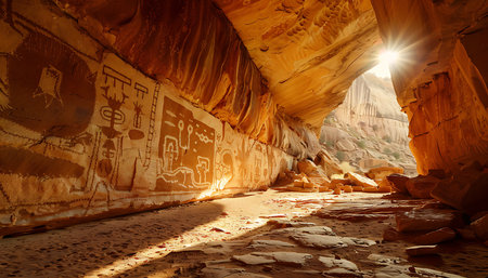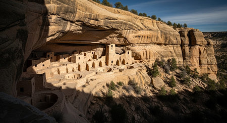 Warm sunlight illuminates a Native American cliff dwelling nestled within a sandstone cave, showing the beauty and history of the American Southwest
