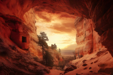 From the cool, dark interior of a natural sandstone cave, a breathtaking view of a sunlit canyon unfolds. This hidden shelter offers a unique perspective, framing the rugged landscape and inviting a sense of adventure and discovery in the wild.