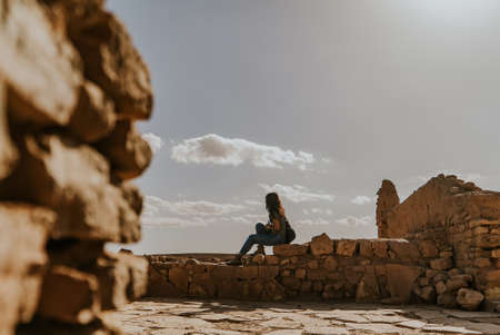 Ait BenHaddou, Marrakech- September 20, 2019: Asian young women wearing army green shirt,with jeans and grey boots sitting on rock with clay surface, on sunny day. Looking the beautiful scenery old town at Morocco