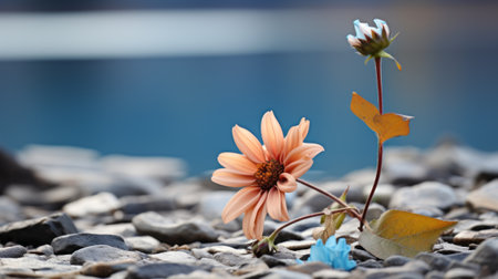 a single flower growing out of the ground in front of a body of water