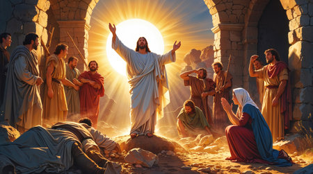 Jesus Christ stands resurrected from his tomb, arms outstretched in a divine glow, as his followers react with a mixture of awe, reverence, and disbelief