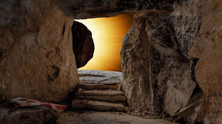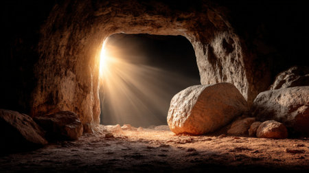 An empty tomb with a large stone rolled away, light streaming in, symbolizing the resurrection of Jesus Christ and new beginnings.