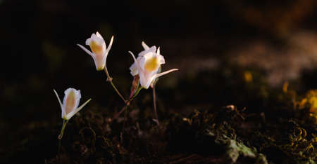 AI Generated. Three Yellow Crocuses Blooming in a Dark Green Meadow