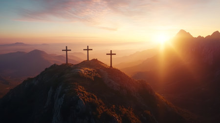 Three crosses stand tall against a breathtaking sunrise, symbolizing faith, hope, and the promise of a new day. Ai generated image